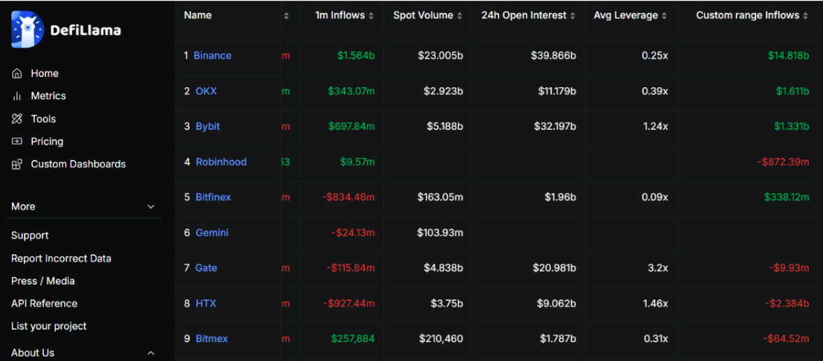 Binance, el mayor exchange de criptomonedas del mundo por volumen de operaciones y número de usuarios, anunció que registró 14.800 millones de dólares en entradas netas durante el tercer trimestre de 2025, según datos de DeFiLlama. En comparación, los diez mayores exchanges centralizados siguientes en conjunto atrajeron apenas 94 millones de dólares, lo que subraya la posición de Binance y la confianza que sigue generando en toda la industria.