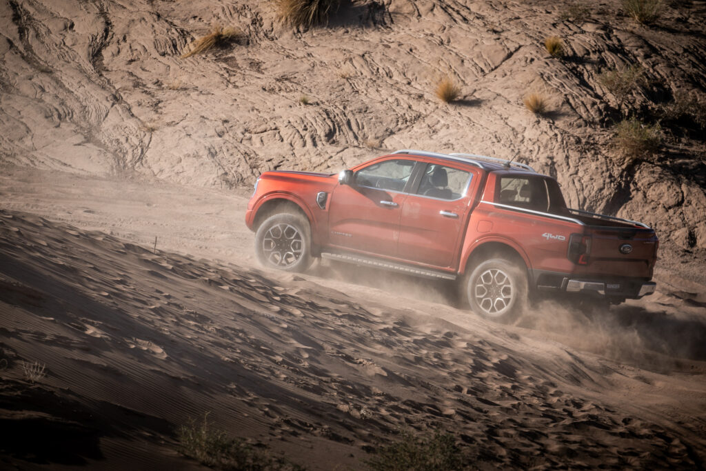 - Desempeño Built Ford Tough: Diseñada para resistir terrenos exigentes, la Nueva Ranger ofrece una capacidad de vadeo de hasta 800 mm, protegiendo componentes clave del motor. Su sistema de gestión de terrenos con modos de manejo ajustables optimiza el rendimiento en diversas condiciones. Esto refuerza su ADN Built Ford Tough, garantizando robustez y confiabilidad.