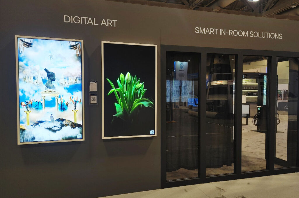 En HITEC 2023, los visitantes también conocieron cómo las soluciones de visualización comercial de LG permiten una amplia gama de experiencias y capacidades para escenarios específicos de la industria hotelera. En la zona del vestíbulo, se muestra una pantalla de 65 pulgadas y 4K que da ejemplo de cómo los hoteles pueden integrar lienzos de arte digital y contenido en vivo proporcionado por Blackdove y Apollo, un servicio de suscripción de arte digital y socio de LG. Junto a este televisor se encuentra el vanguardista Film Transparente LED de LG, que se puede aplicar a superficies de vidrio, incluyendo ventanas.